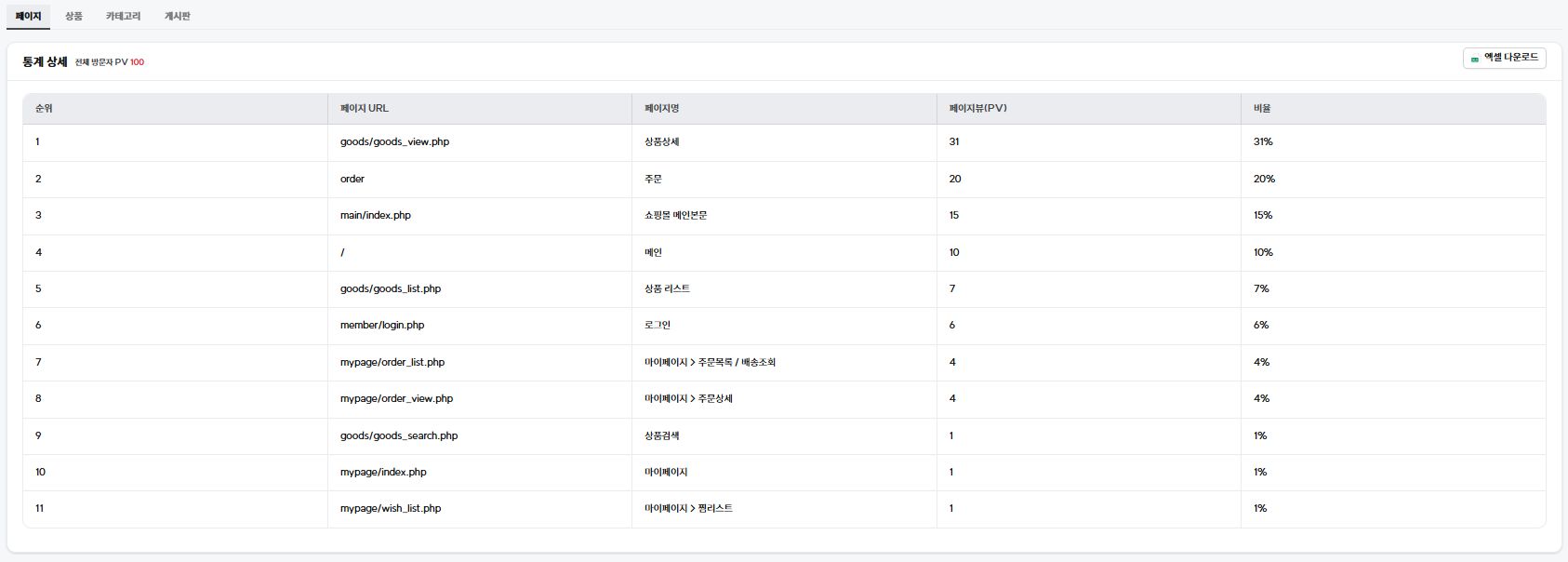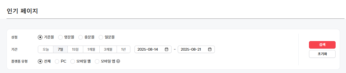 * 상점 : 상점별로 페이지별 PV를 조회할 수 있습니다.