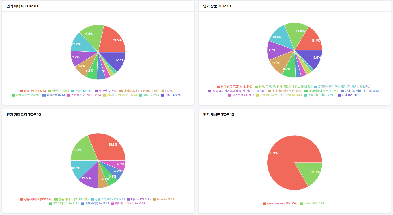 **4) 인기 게시판 :** 쇼핑몰 페이지 경로(URL)별 PV 중 게시판 리스트 및 상세 페이지의 PV 및 URL 뒤 상세 번호나 파라미터를 통해 집계합니다.